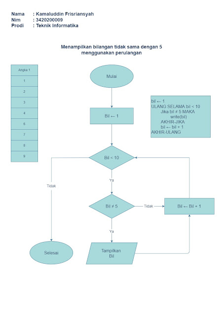 Buatlah algoritma dan program, menyatakan bahwa jika bilangan tidak sama dengan 5 maka tampilkan bilangan. Jika bilangan sama dengan 5 maka bilangan tersebut tidak ditampilkan.